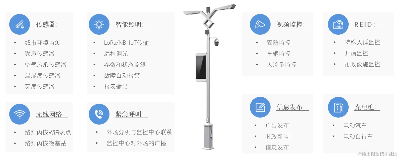 利用路灯杆为载体,由摄像机、智慧路灯杆、充电桩、LED显示屏、环境数据采集传感器等设备组成。基于路灯硬件设施中的视频监控、故障报警等功能,实时监测周边区域的异常,和城市管理、安防等形成一体化服务。