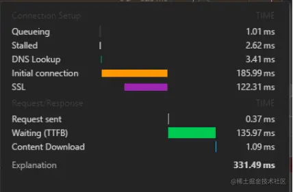 Chrome浏览器开发者工具Network窗口下,可以查看下载各组件所需的具体时间