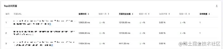 首先开发者的核心诉求是页面响应快,性能好。而上图这个数据无论如何都称不上快,可以看到首屏时间达到了4.8s,LCP的时间超过了4s,仅仅达到了“POOR”的级别,CLS的数据也不容乐观。我们首先仅从表面数据进行分析,对比了该项目下全部页面的数据,通过“Top访问页面” tab对页面进行分析,先按照 “首屏时间” 倒排序。