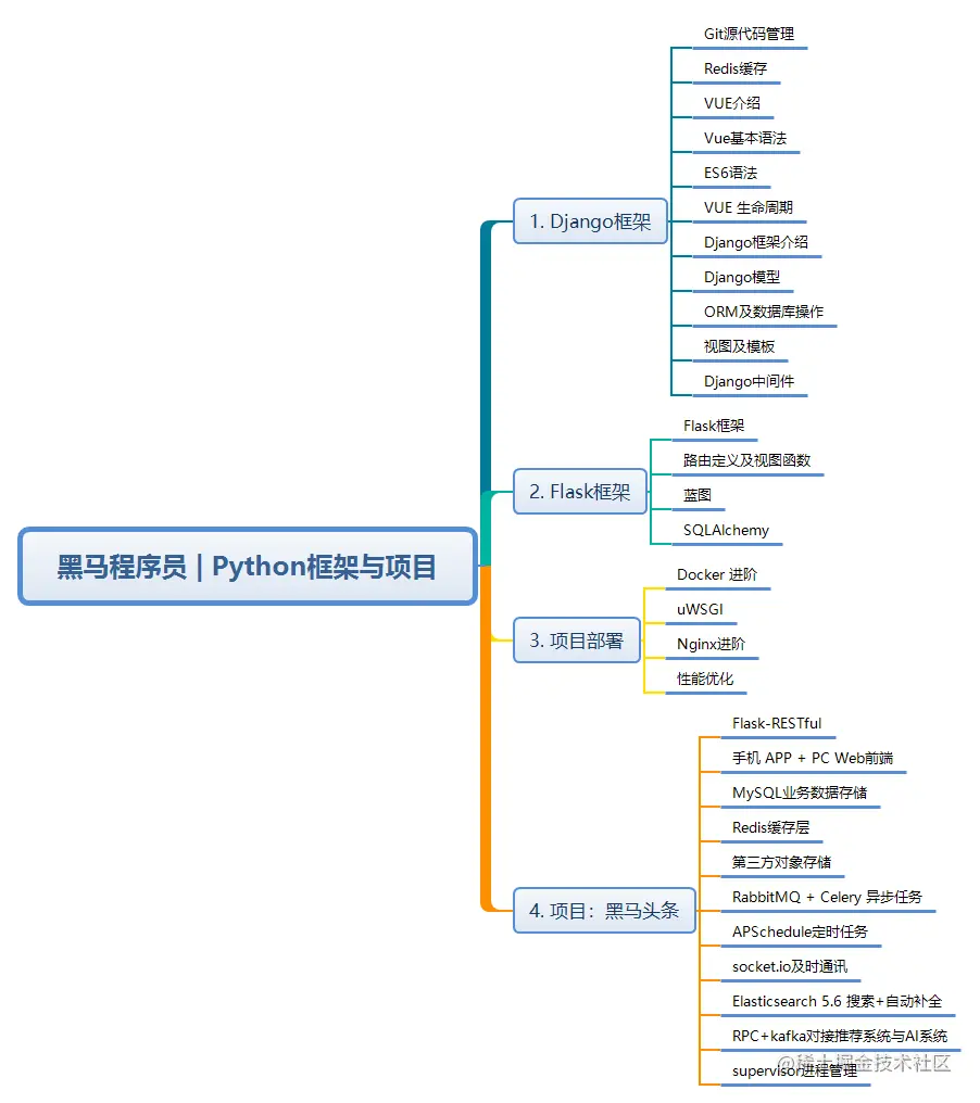 黑马程序员Python自学路线图的Flask框架部分需要掌握Web主流框架-Flask的使用;掌握常见的性能优化技术;缓存服务器的操作和设计;异步任务的实现。
