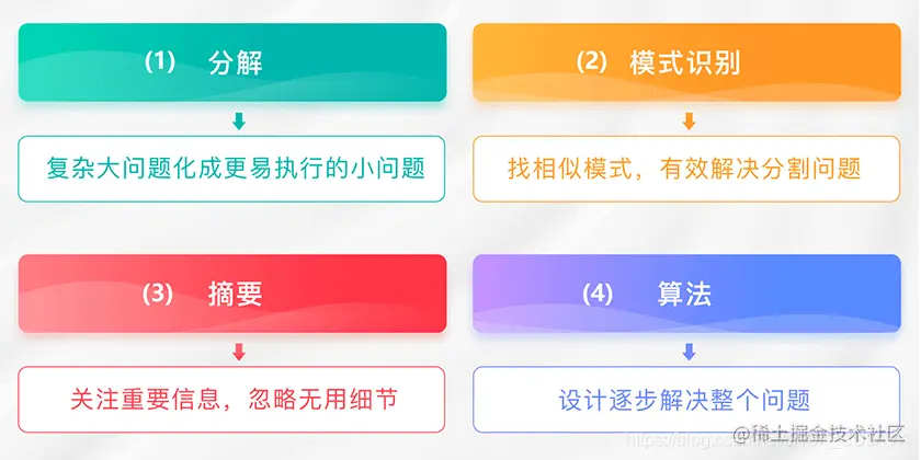 没有编程思维的人,遇到复杂的问题,要么立马乱干,要么束手无策;拥有编程思维能力的人,会按照下图4步走:
