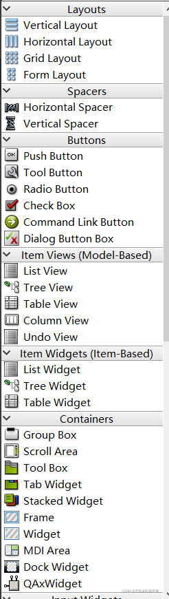 表项组件包括:List Widget(列表表项)、Tree Widget(树状表项)、Table Widget(表格表项)。