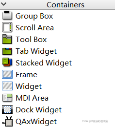 容器组件包括:Group Box(组合框,可以在内部添加内容,并修改标题头)、Scroll Area(带滑动条的框)、Tool Box(抽屉式框)、Tab Widget(标签式框)、Stacked Widget(栈式,需要信号启动)、Frame(带边框的布局)、Widget(不带边框的布局)、MDI Area(分栏显示)、Dock Widget(浮动窗口)、QAxWidget(只可以在Windows环境使用)。