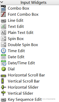 输入组件包括:Combo Box(下拉选框)、Font Combo Box(下拉字体框)、Line Edit(行编辑区)、Text Edit(文本编辑区,只可以查看文字、图片和动画)、Plain Text Edit(文字编辑框)、Spin Box(调整数字框)、Double Spin Box(浮点型数字调整框)、Time Edit(时间)、Data Edit(日期)、Data/Time Edit(时间和日期)、Dial(罗盘)、Horizontal Scroll Bar(水平滚动条)、Vertical Scroll Bar(垂直滚动条)、Horizontal Slider(水平滑动条)、Vertical Slider(垂直滑动条)、Key Sequence Edit(快捷方式)。