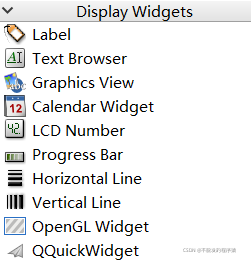 显示组件包括:Label(标签组件,可查看文本、网页、图片和动画等)、Text Browser(文本框)、Graphics View(绘图工具)、Calendar Widget(日历)、LCD Number(LCD 数码管)、Progress Bar(进度条)、Horizontal Line(水平分割线)、Vertical Line(垂直分割线)、OpenGL Widget(OpenGL(Open Graphics Library,开放图形库)图形渲染的部件,可以在PyQt和Qt的应用中显示图形(包括2D和3D图形))、QQuickWidget(加载QML文件)。