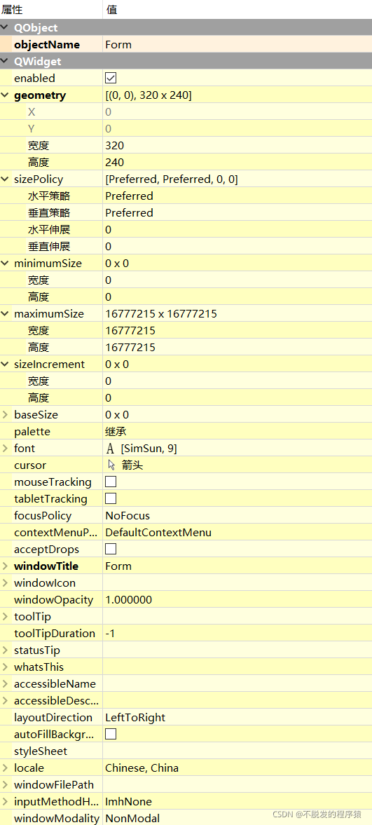 每种组件的属性会有所不同之处,这里以QWidget窗口为例,简单聊聊其属性,如下所示: