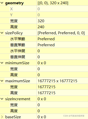 控制组件大小的属性有:geometry 、sizePolicy、minimumSize、maximumSize、sizeIncrement和baseSize,用于控制组件的初始大小以及动态调整大小的控制。属性配置界面的geometry定义了组件的初始大小,其他属性都与组件大小调整时控制组件的大小相关。