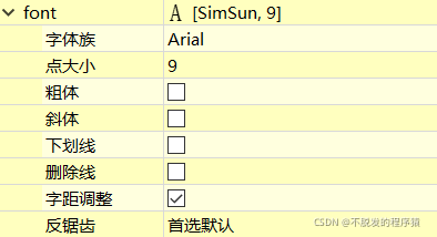 font属性中可以设置组件的字体属性,包括字体的字体簇(Family)、大小(Size)、是否粗体(Bold)、是否斜体(Italic)、是否带下划线(Underline)、是否带删除线(Strikeout)等。