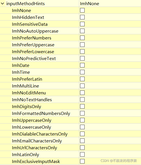 inputMethodHints属性只对输入组件有效,输入法使用它来检索有关输入法应如何操作的提示,例如,如果设置了只允许输入数字的标志,则输入法可能会更改其可视组件,以反映只能输入数字。相关取值及含义如下: