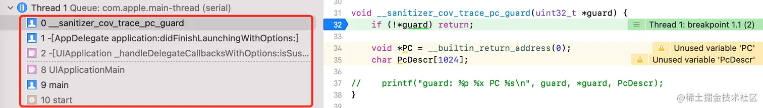 我们会发现一个现象,项目中每一个方法和函数的调用,都会触发__sanitizer_cov_trace_pc_guard的断点,并且由当前执行的方法/函数调用。