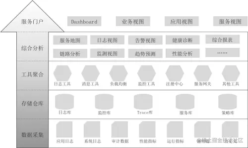 服务治理门户构建从五个层面考虑,包括数据采集,存储仓库,工具聚合,综合分析,服务门户。