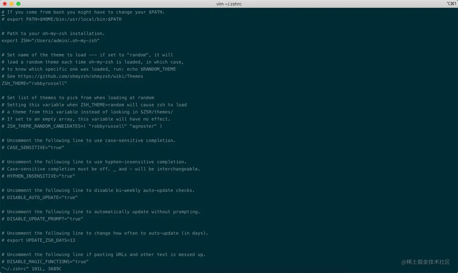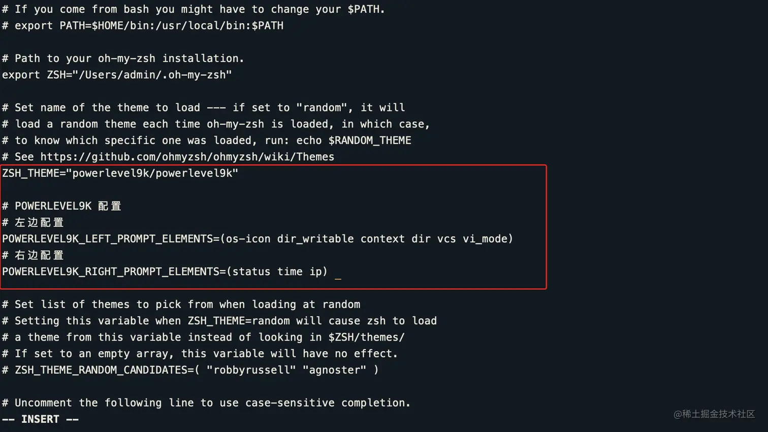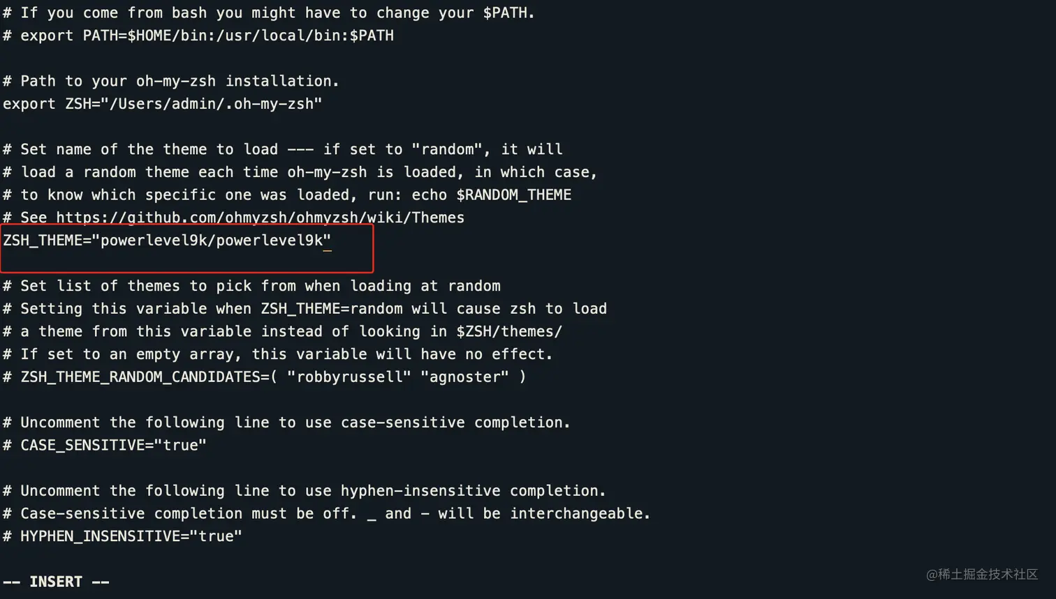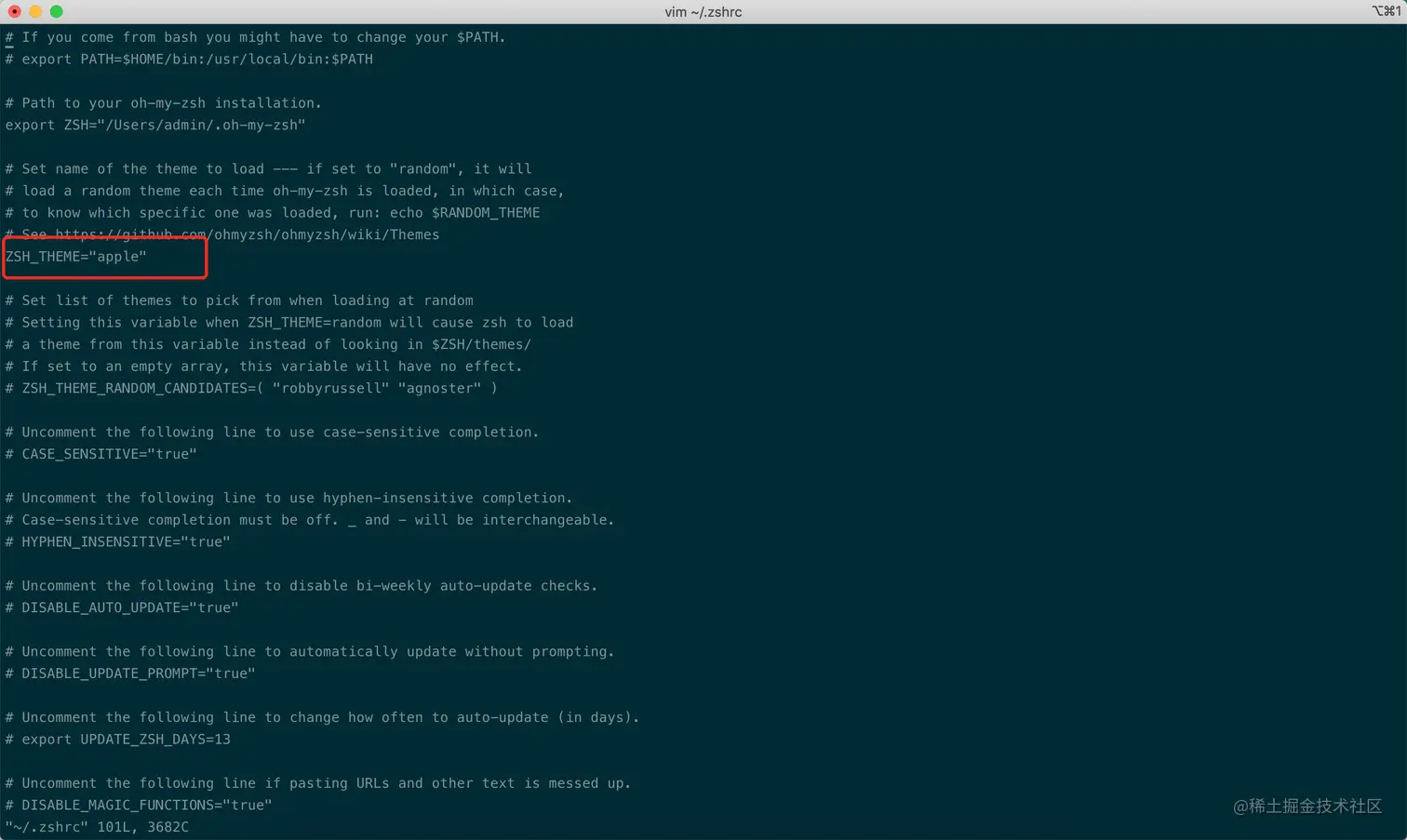 然后按 “i” 键进入编辑模式,把默认的主题:“robbyrussell” 改为咱们想更换的 “apple”这个小苹果主题就OK了