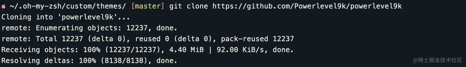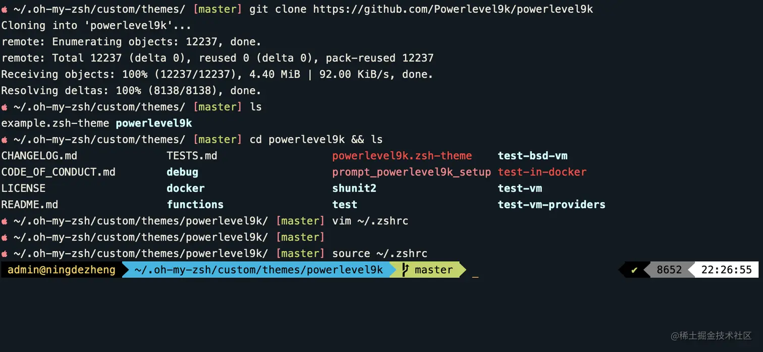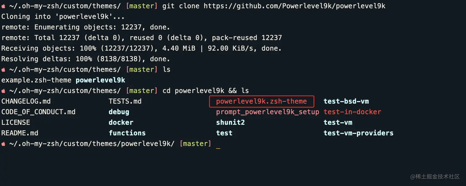 2、然后 把项目克隆到 “~/.oh-my-zsh/custom/themes” 文件中以后查看一下