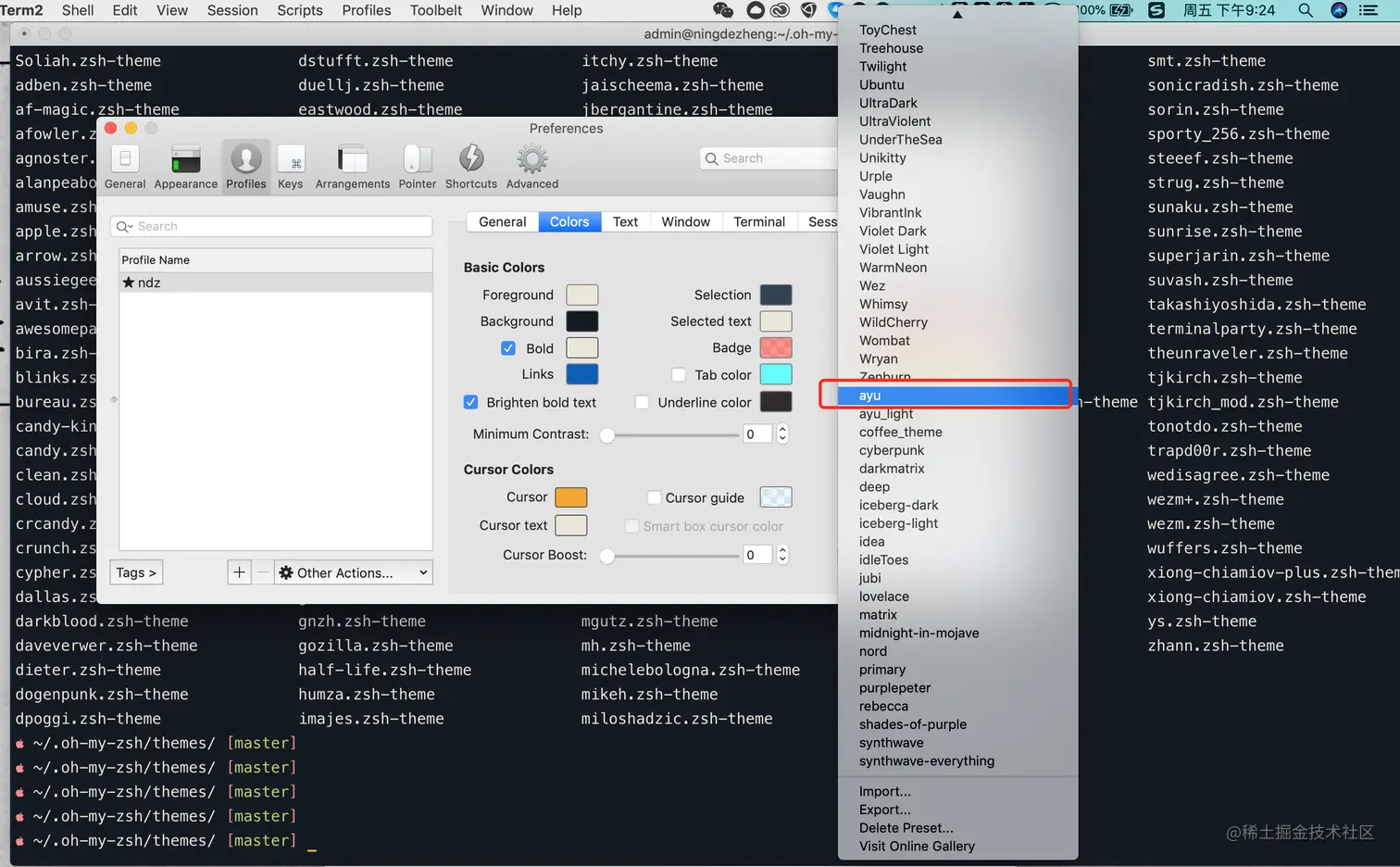 这里iTerm2自带了几个主题,但整体都感觉不太好,网上有很多好看的主题,我们可以一个个配置看一下,