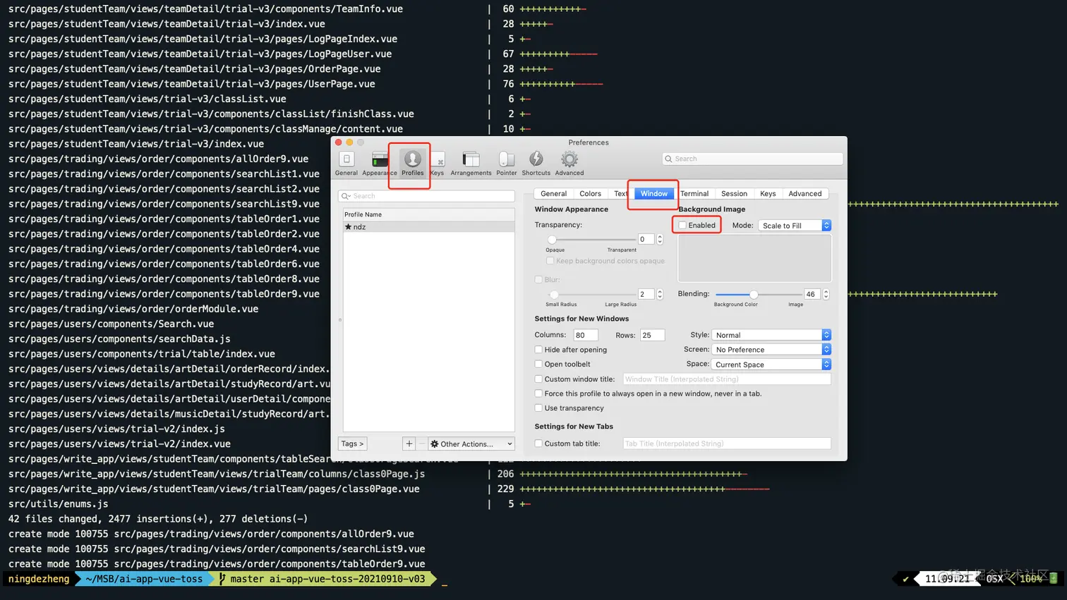 打开“iTerm2 --> Preferences --> Profiles --> Window ” 勾选☑️ Enabled 选择一张自己喜欢的背景图