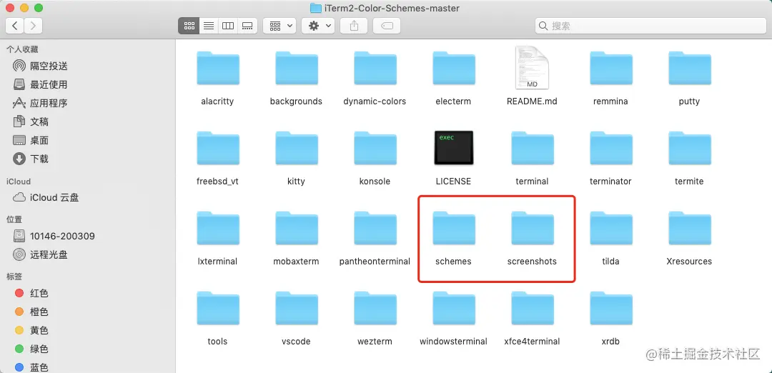 然后 screenshots 文件夹里面这些配色对应的的主题都在 schemes 文件夹中,我们开始导入这些主题