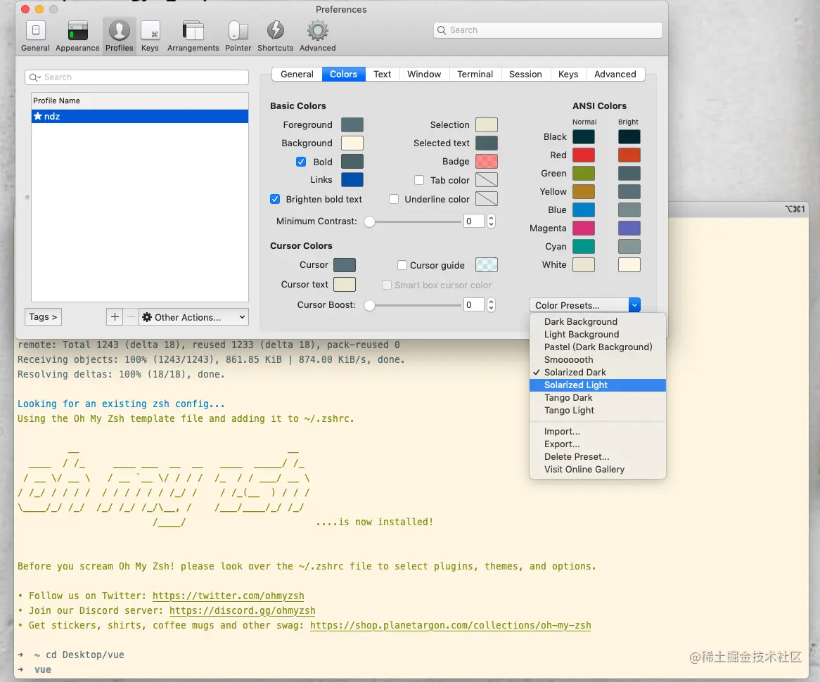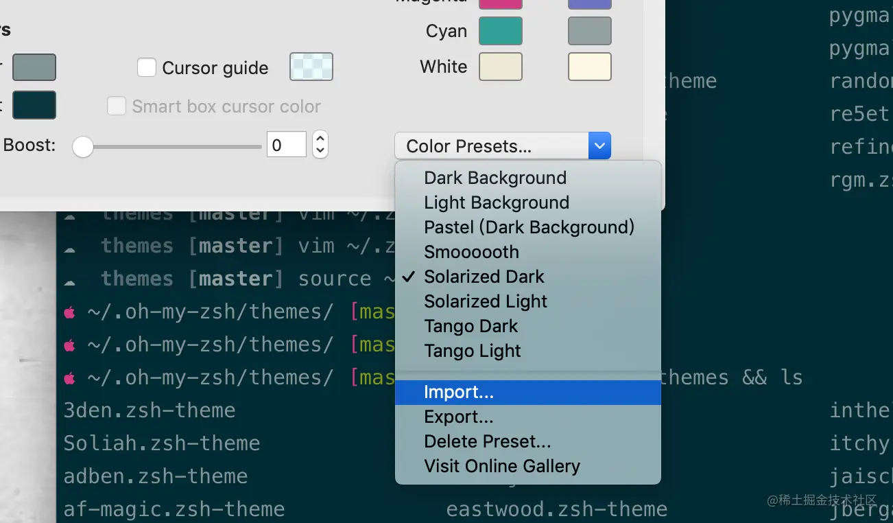 刚才说的这些主题库都是 iTerm2 自己默认的,总体感觉....咋说呢,感觉一般般吧,总觉得和自己理想的差了一些。查了写资料发现了 iTerm2 还支持自己导入 Color Preset 库