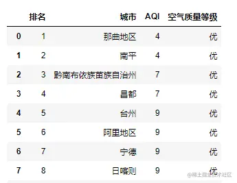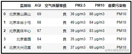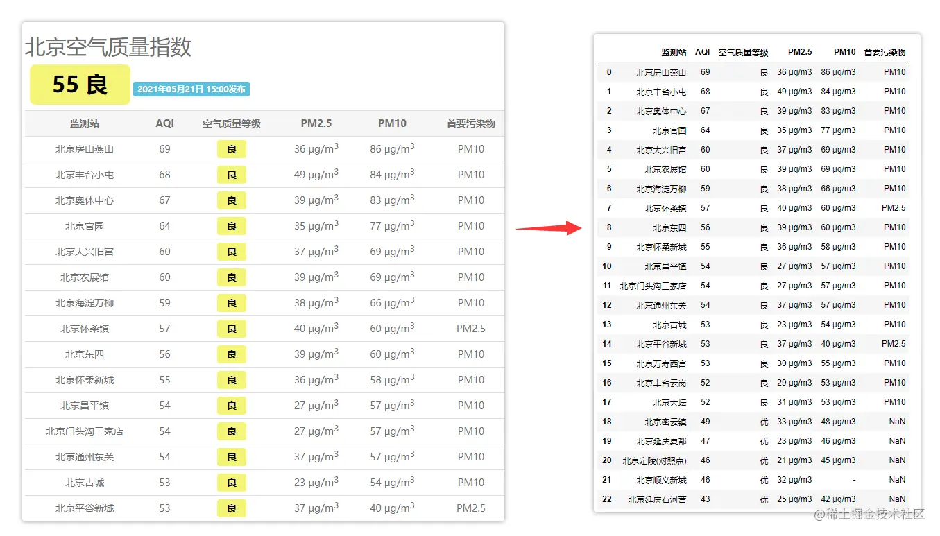 比如还是刚才的网站,空气质量排行榜网页就明显由两个表格构成的。