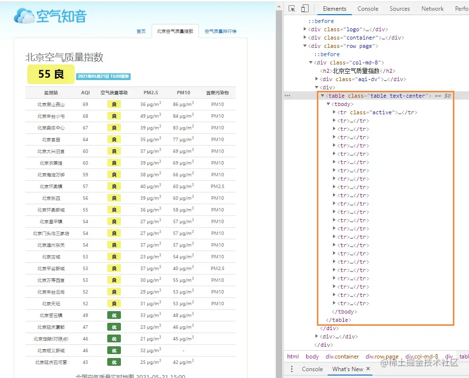 F12,左侧是网页中的质量指数表格,它的网页结构完美符合了Table表格型数据网页结构。