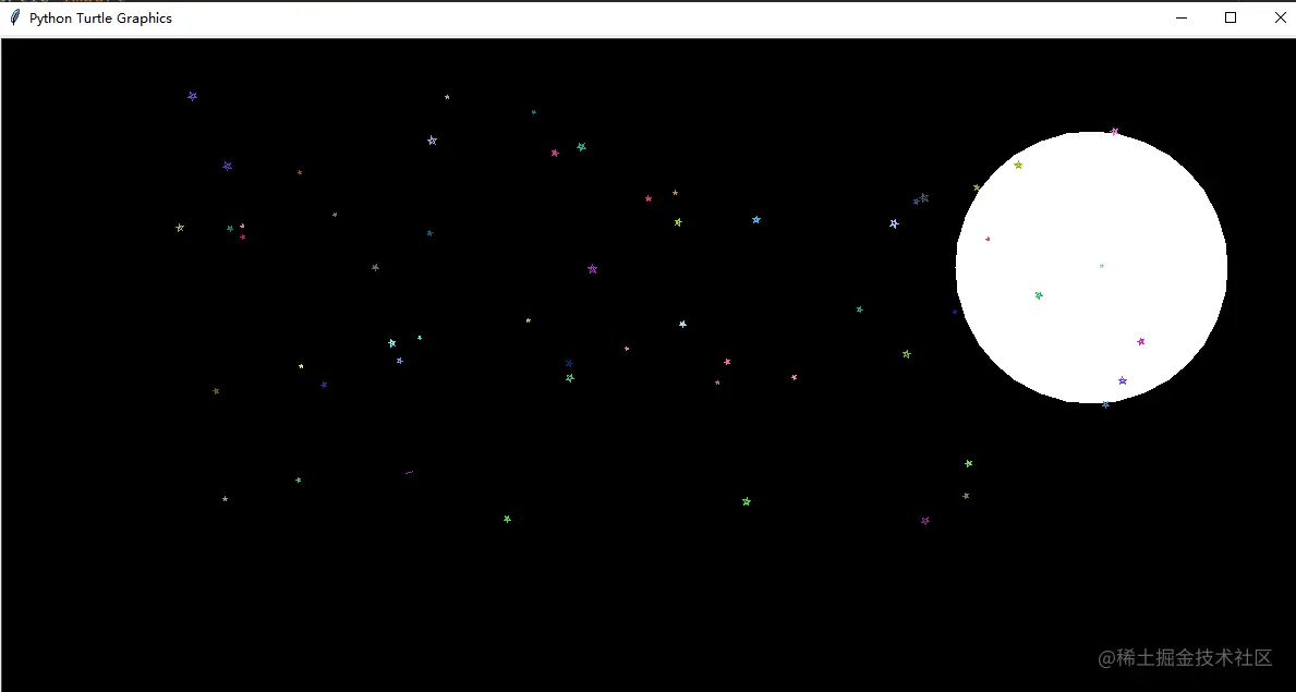 使用Turtle画简易版的圆月星空图如下: