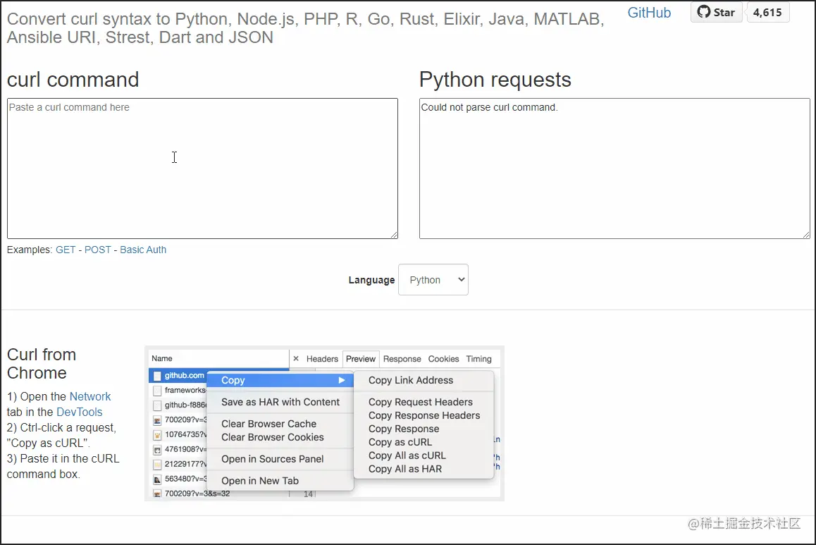 然后打开任意一个可以转换的网站,比如这个*curl.trillworks.com/*。