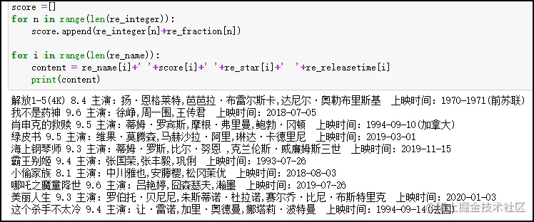 content = re_name[i]+' '+score[i]+' '+re_star[i]+' '+re_releasetime[i]