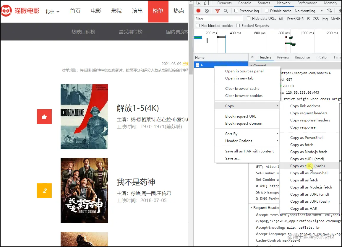 以猫眼电影榜单为例,先在Google游览器中,右键复制网络抓到的网络请求为cURL(bash)。