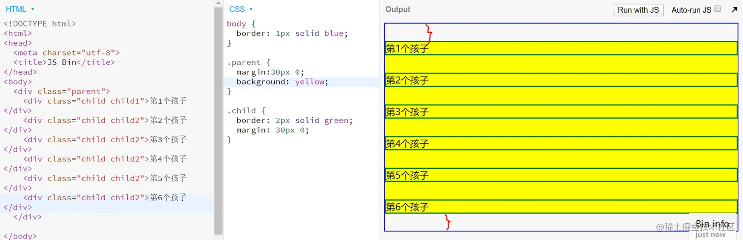 parent的上边距会和第一个孩子的上边距重合,parent的下边距会和最后一个孩子的下边距重合