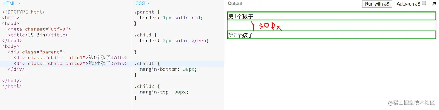 margin能合并就是因为父子的Margin之间没有其他的东西,如果加了border或者Padding就等于在父子的Margin中间加了东西,因此就无法合并margin了