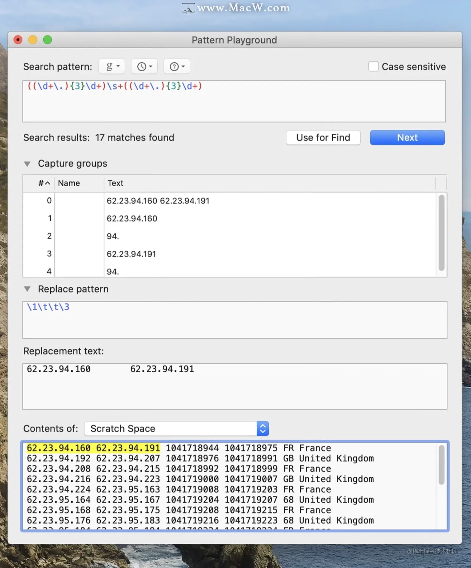 - Pattern Playground”还能把复杂搜索模式拆解为多个部分,并显示与每一个部分相匹配的具体文本。然后,你就可以把这些部分作为替换文本中的变量了。