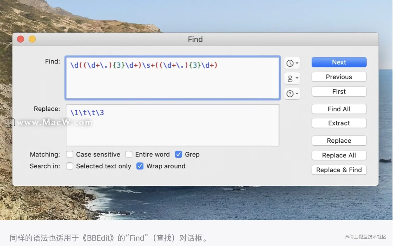 正则表达式语法能让你快速找到并修改特定文本模式一一比如用“ dd/mm/yyyy格式替换所有日期,无 论原始格式是怎样的。《Bbedit》的互动式“Pattern Playground'功能为你提供搜索与替换容的实时预览,你可以利用它来轻松学习正则表达式。