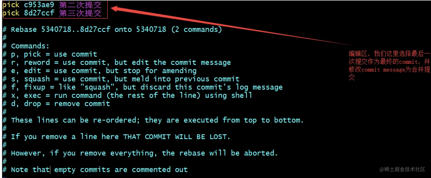 首先执行git rebase -i HEAD2,这里的HEAD2表明的合并最近两次提交,命令执行后会进入到一个vi编辑页面,以下所示: