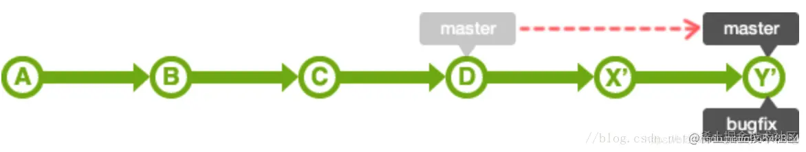 首先,rebase bugfix 分支到 master 分支, bugfix 分支的历史记录会添加在 master 分支的后面。如图所示,历史记录成一条线,相当整洁。
