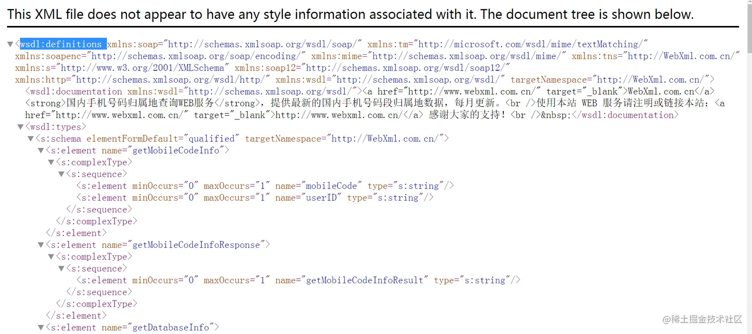 我们用浏览器访问看一下典型的WebService返回的报文: