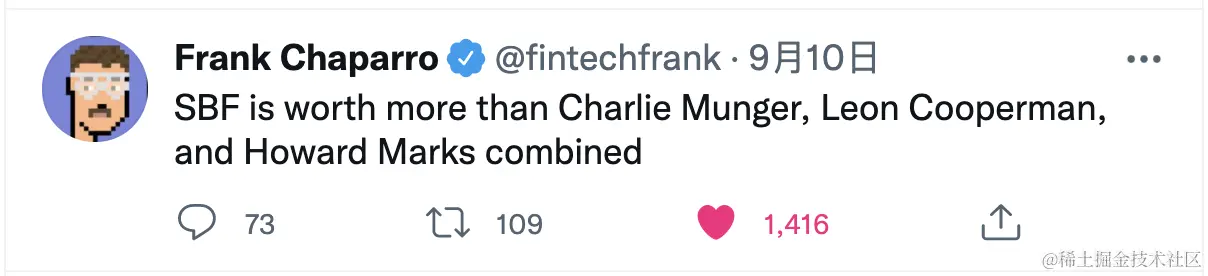 The Block新闻负责人Frank Chaparro透露,目前FTX创始人SBF的财富已经超过查理·芒格(Charlie Munger)、里昂·库珀曼(Leon Cooperman)和霍华德·马克斯(Howard Marks)的总和。