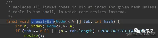 2、当满足条件1以后调用treeifyBin方法转化红黑树。该方法中,数组如果长度小于MIN_TREEIFY_CAPACITY(64)就选择扩容,而不是转化为红黑树。