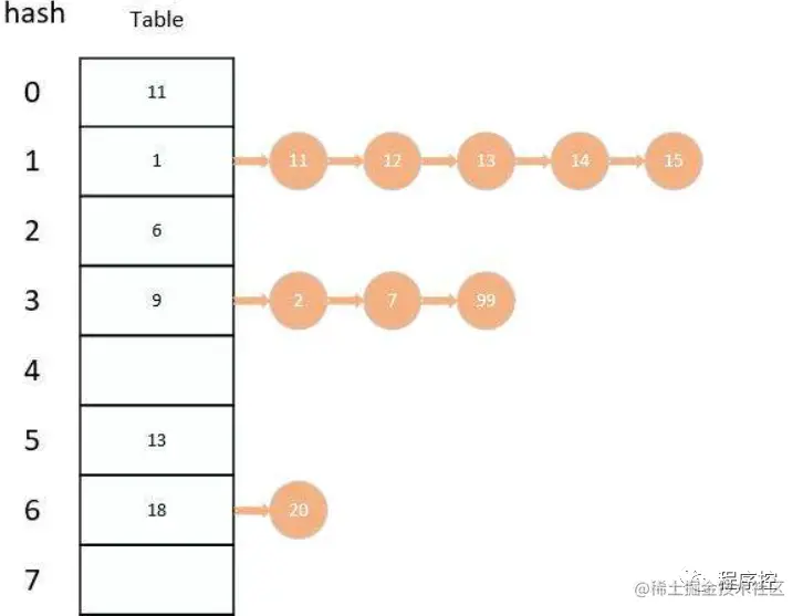 2、**链表法:**把哈希冲突冲突的元素都放在一个链表中,但是链表的长度不能太长,越长效率越慢。(HashMap采用这个方法,但是链表有可能转化成红黑树)