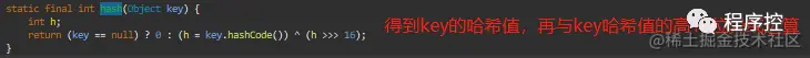 内部包含hash()函数和putVal()函数,hash函数用来求哈希值,putVal()函数用来将key-value键值对放入集合map,我们先看hash()函数: