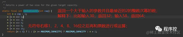 这里我们需要注意第一个构造函数,传入初始容量和负载因子,如果初始容量小于0抛出异常,大于最大容量MAXIMUM_CAPACITY则置为MAXIMUM_CAPACITY;如果不是这俩个会进入tableSizeFor()方法,一起来看看: