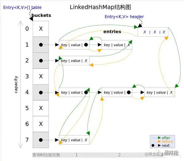 上面图为LinkedHashMap整体结构图,内部的循环双向链表的头部存放的是最久访问的节点或最先插入的节点,尾部为最近访问的或最近插入的节点****。