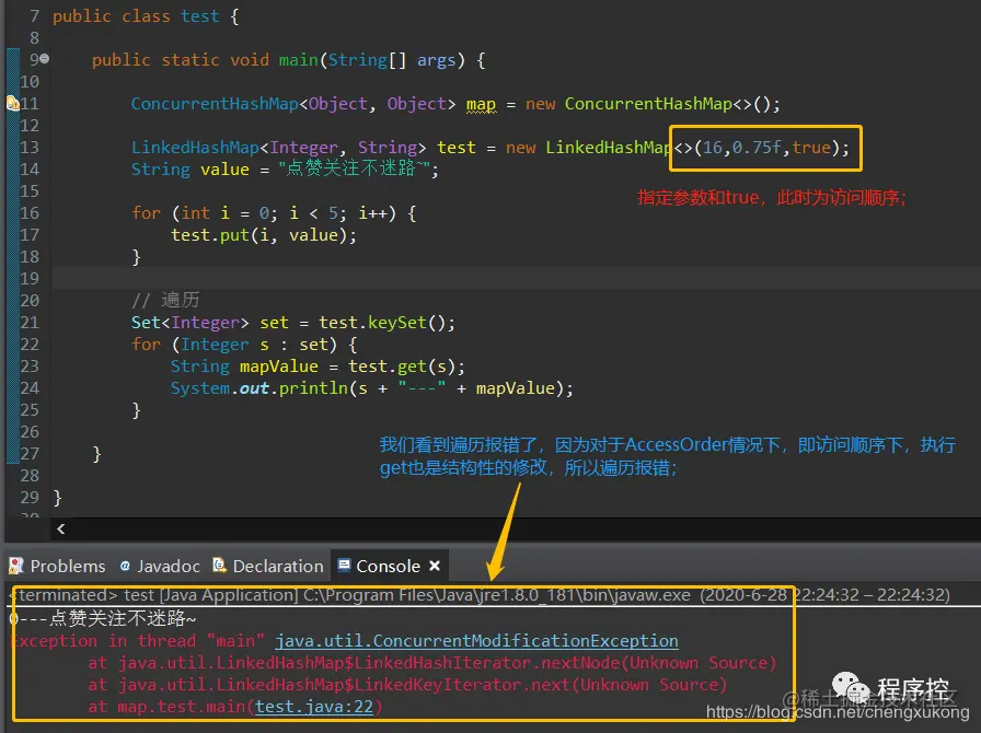 因为在访问顺序下,执行get也是结构性的修改(需要根据访问时间修改),所以变遍历并发修改异常,换种方式来看看效果: