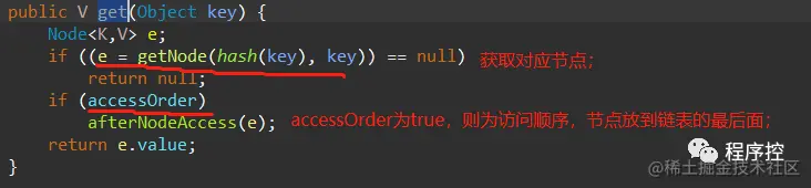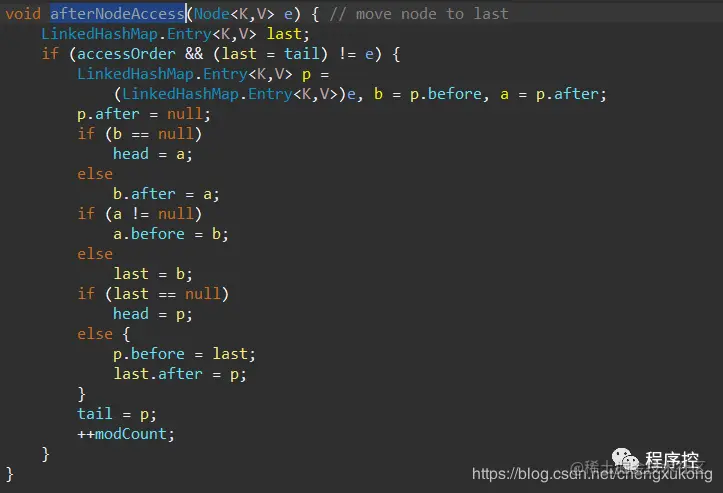 如果true,则为访问顺序(head为最晚访问,tail为最早访问),进去afterNodeAccess方法看: