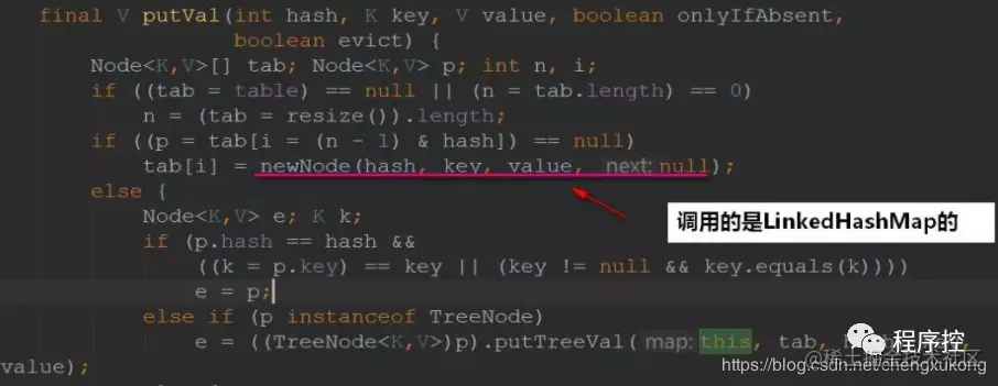 但是,其中在**putVal()**创建节点的时候,调用的是LinkedHashMap重写的方法。