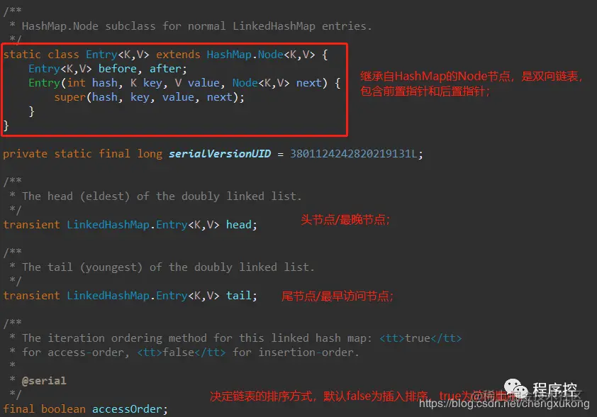 还有一个很重要的boolean型属性accessOrder,决定链表的排序方式,默认false为插入排序(head和tail存储头节点和尾节点),true为访问顺序(head为最晚访问,tail为最早访问)。