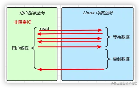 其实这种非阻塞IO并没有什么特别好的提升,它牵扯到了用户程序空间和Linux内核空间的多次切换。 切换的太频繁反而会影响系统的性能。