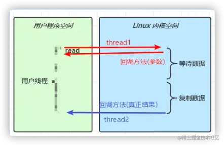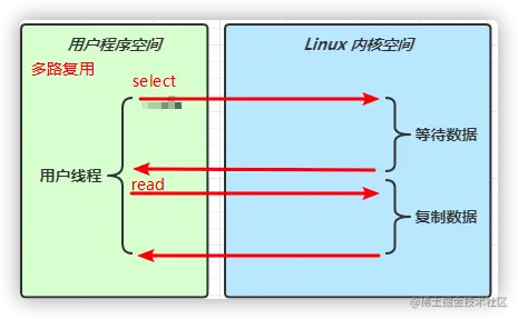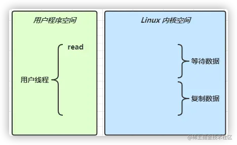当调用一次 channel.read或 stream.read 后,会切换至操作系统内核态来完成真正数据读取,而读取又分为两个阶段,分别为: