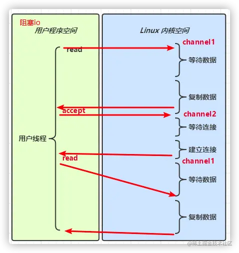 简单来说一下就是阻塞IO在与channel2