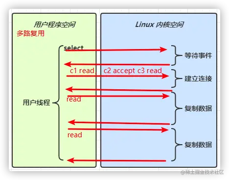 read方法,而是去调用select,它会阻塞住,看有没有事件,一旦有事件,内核会告诉它有事件发生了,然后用户就可以根据selectorkey去拿到channel,然后调用read,在read期间,一旦复制数据,它还是会阻塞。