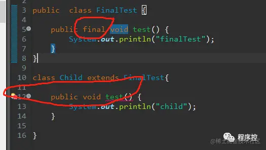 当我们按照上面那种写法写时,发现没有问题,正常继承,此时我们在父类test函数上加上final关键字试下: