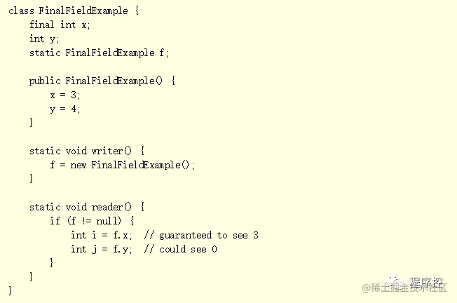 这个例子定义了一个final变量x和一个普通变量y,在构造函数中赋值,如果此时有两个线程开始分别调用writer()和reader()方法